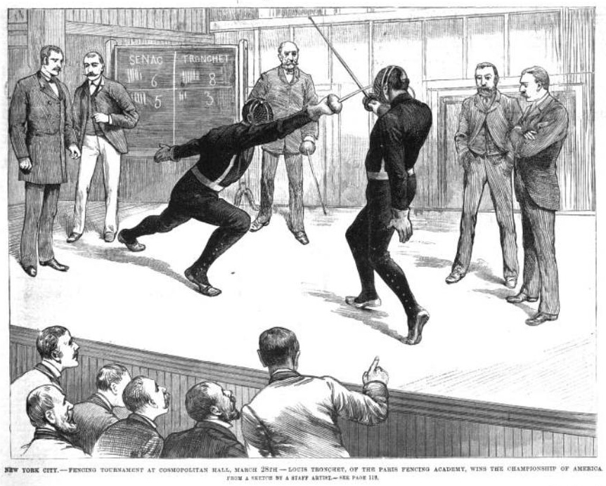 “The Americans have no patience to learn to fence well. Some of them try it, but they give it up soon. I tell you, sir, it is the best thing in the world for the men—and the ladies, too. It is not violent and rough, like boxing, and it does not strain the nerves, like rowing, but it makes the warm blood run through your body, and it makes health come. Besides it strengthens you wonderfully. A wealthy gentleman of Boston—Mr. Whitcomb, now in Paris—came to me when he was about 40, and said, “Colonel, I am afraid of consumption.’ I said, ‘I will cure you, come and fence.’ He did, and where he had been stoop-shouldered he is now strong and hale, and over 60 years of age. Such is the beauty of fencing.”