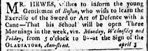 At the center of the incident was one Robert Hewes (1751-1830), a Boston native, local eccentric, and fencing master. Described by his contemporaries as an “extraordinary” and “ingenious” man, Hewes was a former member of the secret revolutionary society, the Sons of Liberty, and the first American fencing instructor that we know of to publicly advertise instruction in cane defense. He was described by the Boston press as a surgeon, as well as a “celebrated bone-setter and fencing master.” In acknowledgement of this fact, Hewes hung a sign outside his residence which humorously read, “Bone breaker and bone-setter.” According to Hewes himself, his training in fencing began about 1770, at which time he entered the school of the Scottish Highlander, Donald McAlpine.