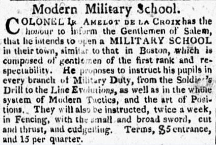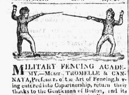Evidently, Louis Millet had recently arrived in Boston, for very the same day he posted his challenge to Hewes, he also published (in the same issue) his first fencing advertisement in the city, informing the public that he offered instruction in the “polite and useful art of Fencing, with Cut, and Thrust, and Small Sword, at reasonable prices.” Millet was also associated with a group of French instructors, including Messrs. Tromelle and Girard, at the military fencing school of Colonel Amelot De La Croix, also in the Boston area (Independent Chronicle, March 20, 1809).