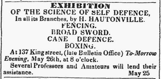 SOME Fencing Masters have read in the Columbian Centinel, the observations of a Mr. Robert Hewes, styled Primary Military School—setting forth the advantage of the Scotch Broad Sword—Experience having demonstrated to then, that the gentleman infallible to a mistake, without enlarging on the observations, which would demonstrate that even a slight wound on the arm would not prevent his antagonist from thrusting his sword through his body, and without remarking, that gentlemen in the habit of fencing with baskets, as it has been observed, would soon be disabled in the hand if armed with an ordinary Sabre—In order to prove in an undeniable manner, what they now assert—the Fencing Masters have the honor to invite Mr. Hewes, respectfully to attend the general assault—to be given on the 23d inst. at the Military School, Court-street, No. 17, where he may have his choice in any kind of fencing, or cane-fighting, on the true principles of the Paris Academy. They flatter themselves that Mr. Hewes will not fail to appear—his assertions render his presence indispensible, and the Spectators are entitled to a demonstration.