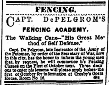 “Fred Englehardt is probably the best amateur. He is very quick, and his passes are made beautifully. Next to him is Mr. Ribolle, who, though only a pupil, gives good promise of being a fine swordsman. He is especially proficient with the broad sword. Then young Mr. Arnold is excellent with the cane. Mr. K. G. Nixon is a clever handler of the cane, the foil, and the single stick, and will yet prove a formidable opponent to the most expert. There are also Sparling, Ryerson, Hansen, Barker, Mason, and Gregory, all Chicagoans, and all quick and neat in their ways.”