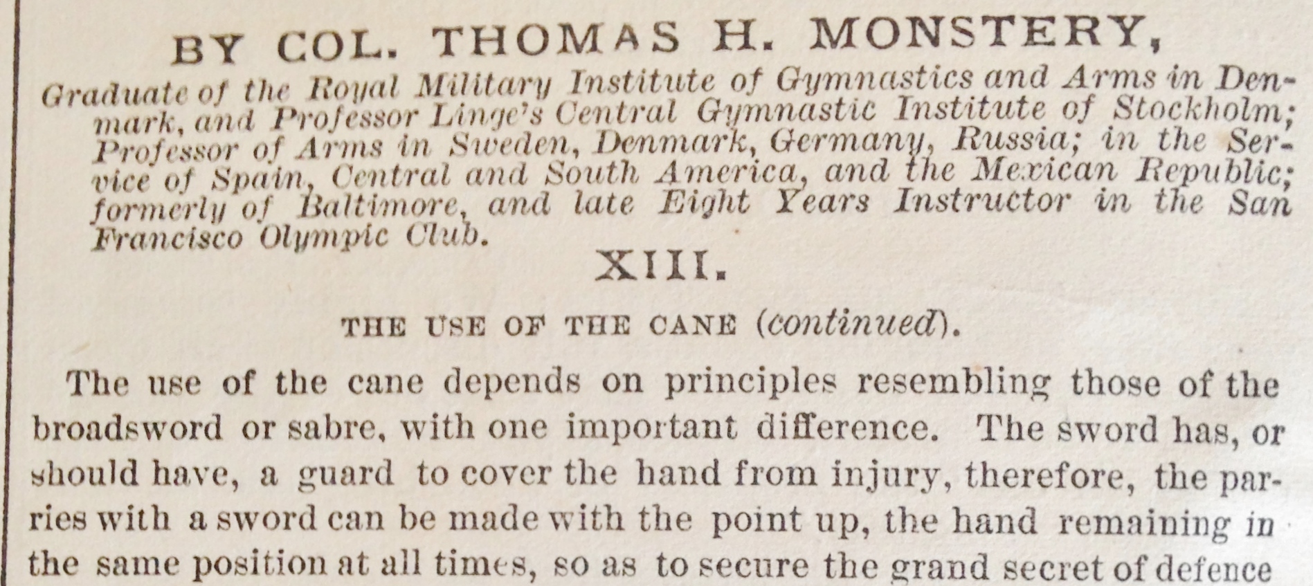 Although he passed away in 1901, Colonel Monstery‘s martial wisdom survives in Self-Defense for Gentlemen and Ladies: A Nineteenth Century Treatise on Boxing, Kicking, Grappling, and Fencing with the Cane and Quarterstaff, which was recently published by North Atlantic Books in book form for the first time. This volume contains a new, detailed biography of Monstery, and includes additional writings by the Colonel.