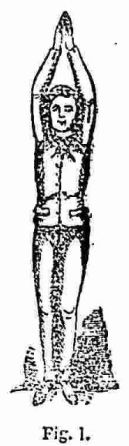 Roll up the sleeves as much as possible. Gather all the slack of the Jacket in one hand, preferably the left, and hold it on the small of the back. With the legs well apart, so as to give a firm and broad base, form an obtuse angle by bending the body forward. Hold the disengaged open hand at arm’s length with the palm out toward the opponent’s face and about a foot from it. (Figure 1.) Keep the position when sparring for a hold, which consists primarily in grabbing some part of the jacket. Agility and keen sight are necessary to do this effectively.