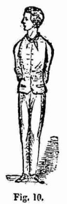 The coat used for Cornish wrestling can be easily made at home. It is of stout canvas, with no collar, loose, elbow sleeves, and a tail coming well down over the hips. It is built so that it will lack about eight inches of meeting over the chest. The fronts are joined by three pieces of stout rope hooked over buttons, securely sewed, so that hard pulling will not loosen them. The topmost rope is across the nipples, and the space between each rope is eight inches. The sleeves are loose, so that a wrestler can get a hand up and through them for certain holds. The jacket is skimpy in front to prevent holds, the ropes, which fasten the coat on, reducing the chances of holds to a minimum. The tail is long, so that the wrestler can make the coat fit snugly and still further reduce his opponent’s opportunities for a hold by gathering up back of him as much of the tail and coat as he can.