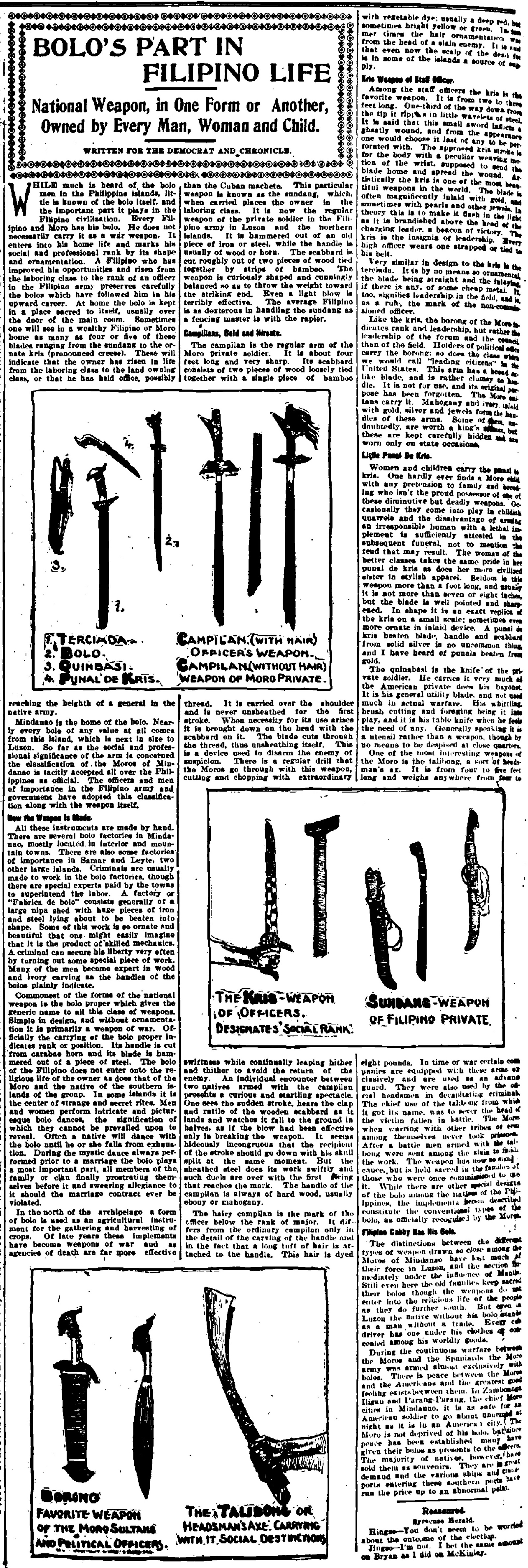 On October 28, 1900, a lengthy article appeared in the Rochester Democrat and Chronicle, describing the many weapons used by the native inhabitants of the Philippines, as well as details pertaining to the method of their use, and rituals in the duel. The article, complete with illustrations, is probably one of the first in America to detail the martial culture of the Philippines, and is almost certainly the first such article to appear in New York State. Although Filipino martial arts such as Kali and Arnis had likely not yet made their appearances in New York, this article offers a fascinating glimpse at how such fighting arts were viewed by visiting Americans at the turn of the century.