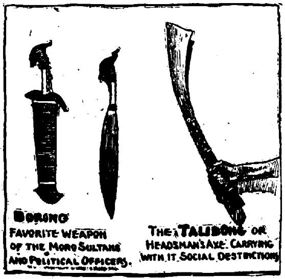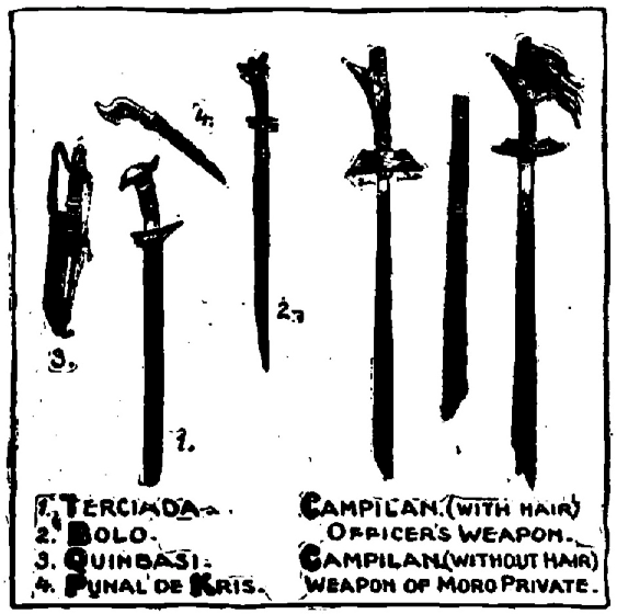 “It is carried over the shoulder and is never unsheathed for the first stroke. When necessity for its use arises it is brought down on the head with the scabbard on it. The blade cuts through the thread, thus unsheathing itself…There is a regular drill the Moros go through with this weapon, cutting and chopping with extraordinary swiftness while continually leaping hither and thither to avoid the return of the enemy. An individual encounter between two natives armed with the campilan presents a curious and startling spectacle. One sees the sudden stroke, hears the clap and rattle of the wooden scabbard as it lands and watches it fall to the ground in halves…It seems hideously incongruous that the recipient of the stroke should go down with his skull split at the same moment. But the sheathed steel does its work swiftly and such duels are over with the first swing that reaches the mark.”