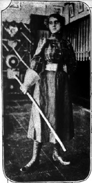 At the school the writer was recently permltted to be present during a class hour for the younger members. The classroom occupies the entire floor of a large Broadway building. The floors are carpetless and covered with oilcloth, and along the walls are trophies of combat—swords, formidable looking daggers and “royal canes.” A dozen or more girls in slight, loose fitting gowns, the skirts a little below the knee, with dark boots, were about to begin their work.