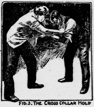 The cross collar hold, described below, is generally barred in present day bouts, but it is given with the idea that some knowledge of it may come in useful at some time or other for purposes of self-defense against a ruffian. It is one of the most effective choking holds known. As in all forms of wrestling, many of the hundred or more holds possible in Cornish can be studied out and gained after a little practice with the three described.